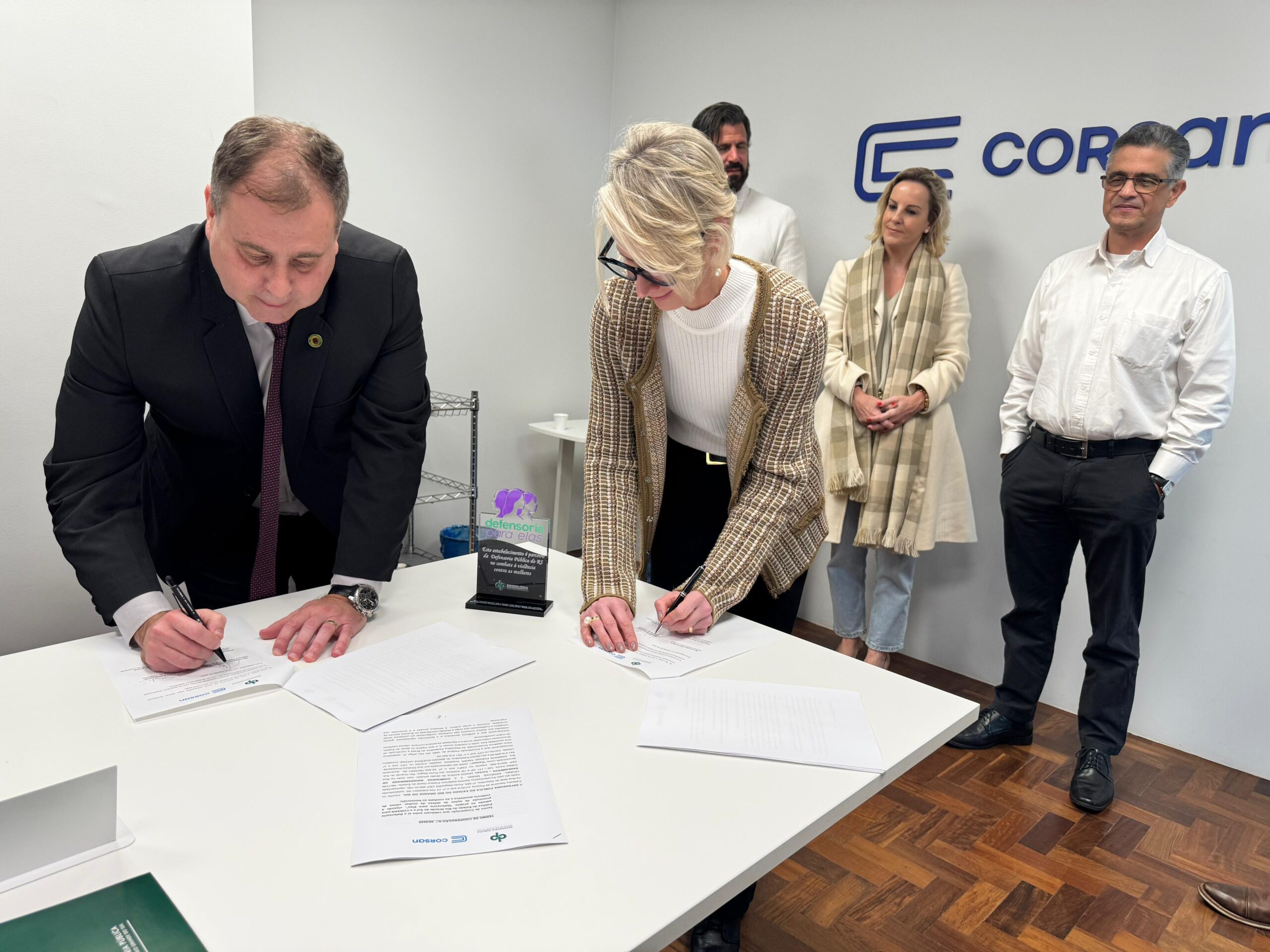 A Corsan foi a primeira empresa do Rio Grande do Sul a aderir, na tarde da última terça-feira (12), ao projeto “Defensoria para Elas”, desenvolvido pela Defensoria Pública do Estado com o objetivo de promover ações de defesa da mulher vítima de violência doméstica e de combate ao feminicídio. A medida é um forte avanço para defender as mulheres gaúchas.