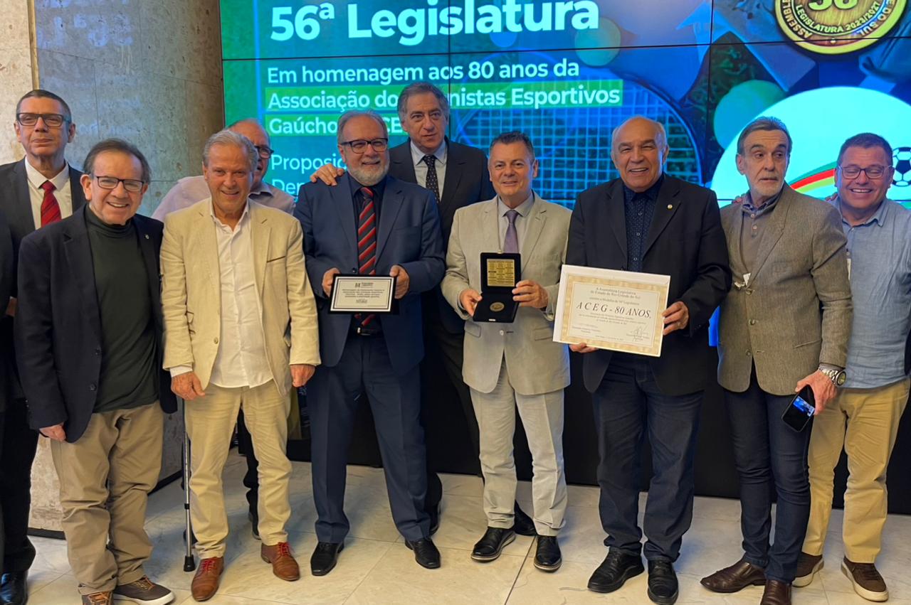 Em concorrida solenidade realizada nesta segunda (13), no Salão Júlio de Castilhos da Assembleia Legislativa, o deputado Gustavo Victorino (Republicanos) homenageou os 80 anos da Associação dos Cronistas Esportivos do RS com a entrega da Medalha da 56ª Legislatura.