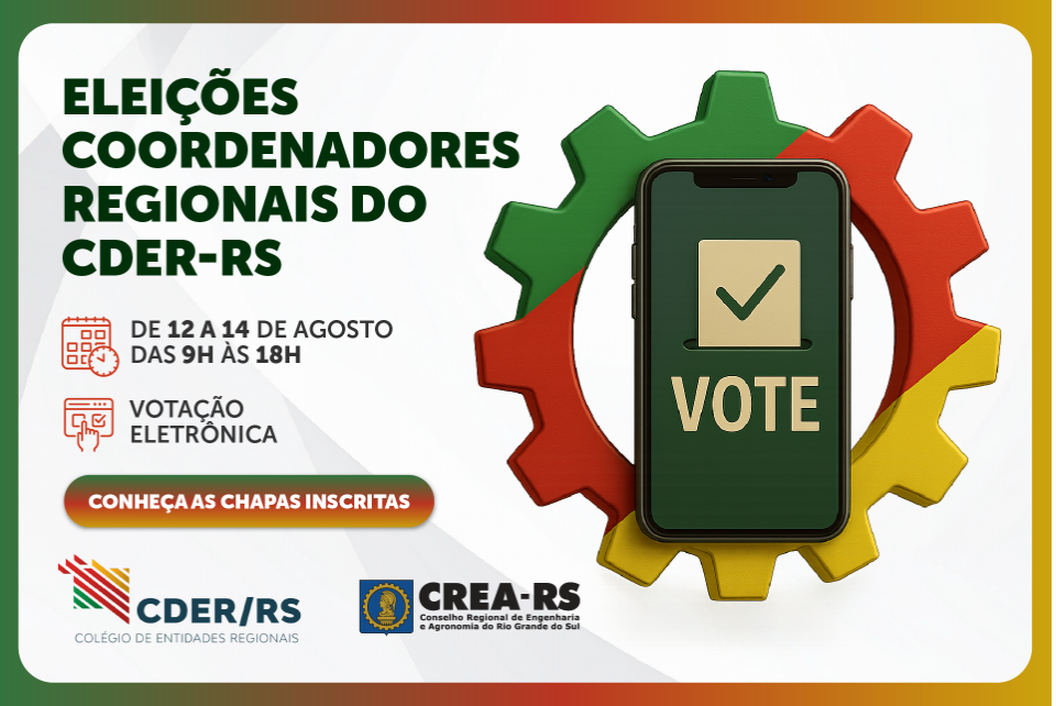 Profissional, a votação eletrônica para a chapa dos cargos de Coordenadores Regionais Titulares e Suplentes ocorrerá a partir das 9 horas do dia 12 de agosto de 2025 (terça-feira) até às 18 horas do dia 14 de agosto de 2025 (quinta-feira).Somente profissional em dia com as obrigações perante o CREA-RS, e sócio de entidade de classe poderá votar, acessando o site do CREA-RS (www.crea-rs.org.br). Durante o horário de atendimento externo das Inspetoria e Sede, haverá um computador à disposição nestes locais, para votação.