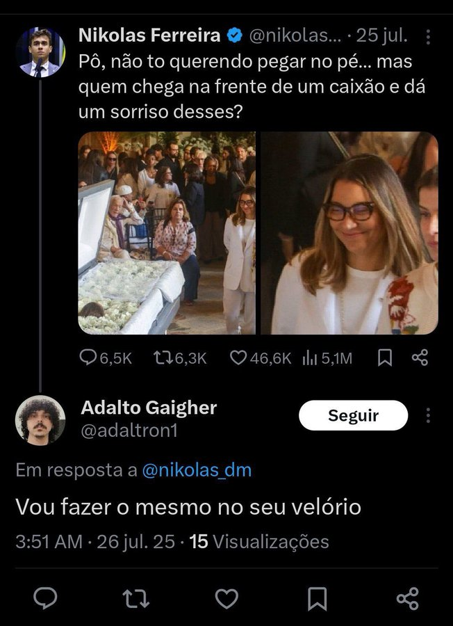 O ativista de esquerda chegou a conclamar em um post: “Alguém mata esse cara namoral”. Nikolas respondeu ao destacar: “Desde 2023 desejando minha morte”.