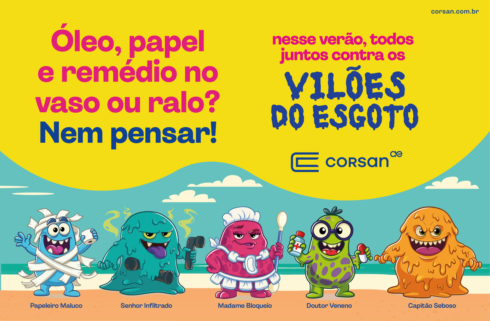 - Capitão Seboso – simboliza o descarte inadequado de óleo de cozinha na pia, um dos principais causadores de entupimentos nas redes. Cada litro de óleo descartado incorretamente também pode contaminar até 10 mil litros de água, causando danos à fauna e à vegetação aquática.