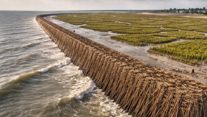 Uma intervenção costeira no norte da holanda transforma galhos, areaia dragada e fragmentos de salicórnia em um experimento de restauração natural capaz de criar um sapal de 15 hectares, recuperar vegetação halófila e reforçar a proteção contra o avanço do mar.